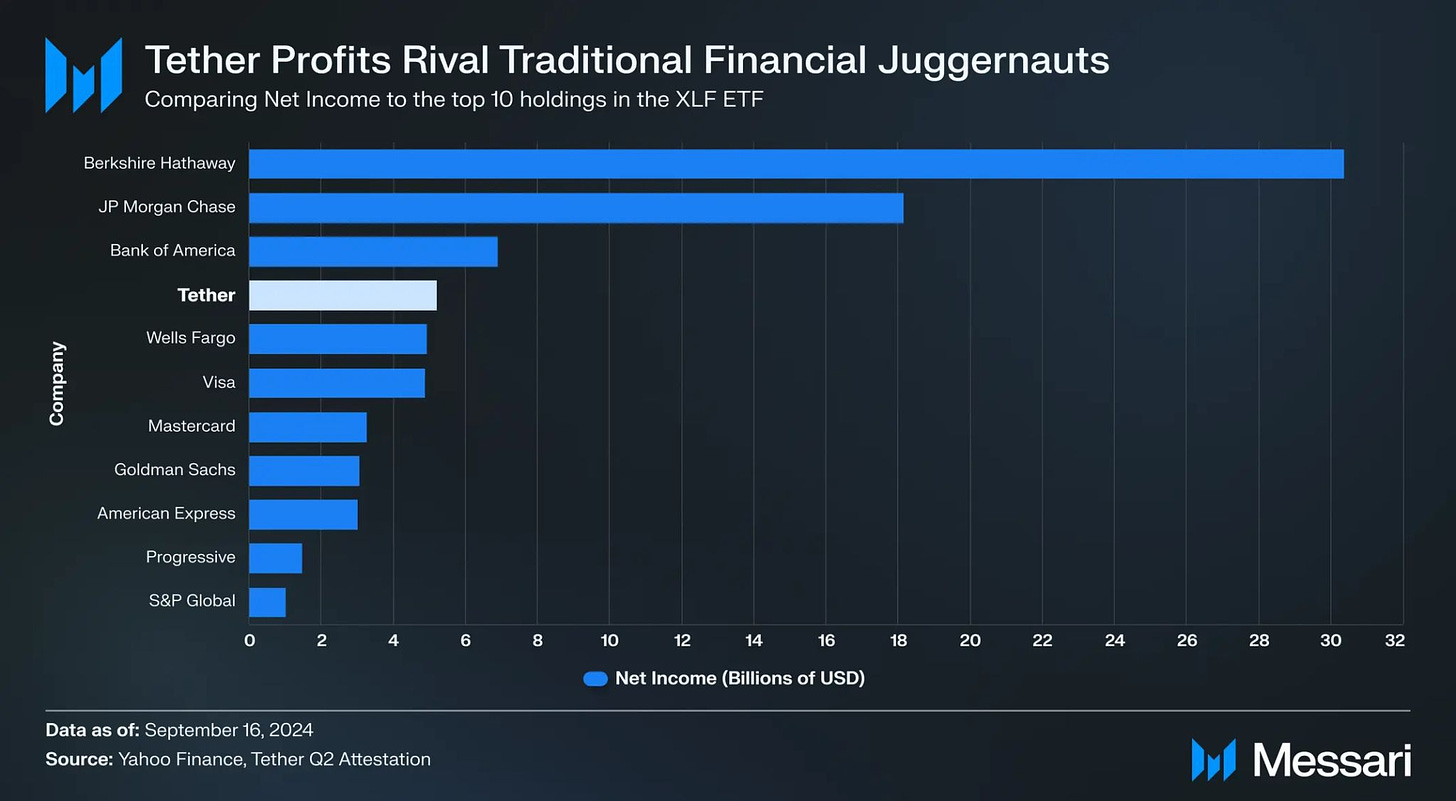 特别是 Tether,因其在金融生态系统中的快速崛起和主导地位,常常与主要的 Web2 金融公司如 JPMorgan、Visa 和 Mastercard 相提并论。在短时间内,它成功超越了许多传统巨头,在市场覆盖率和与加密市场的整合方面取得了领先。