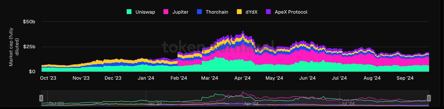Uniswap 仍然是最大的去中心化交易所,持续产生强劲的交易量。然而,随着 Solana 最近人气的激增,Solana 原生的去中心化交易所如 Jupiter 开始显著占据 Uniswap 的市场份额。