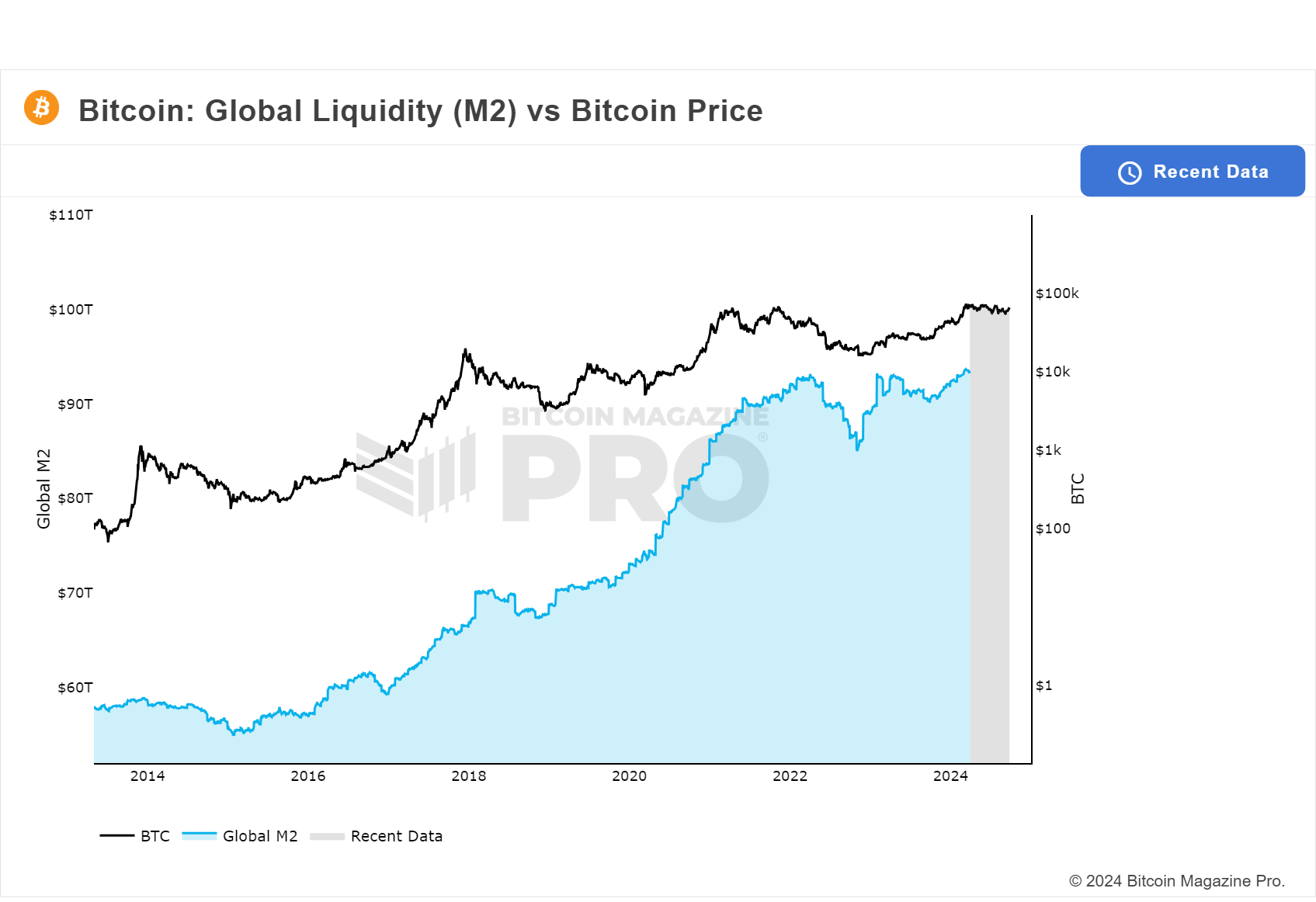 Bitcoin Magazine Pro 提供了一个全球 M2 指标 ,由于反映了全球可用资金总量,这是全球流动性的一个良好代表。另一种理解方式是,它衡量了全球经济中信用创造和央行印钞的总量。