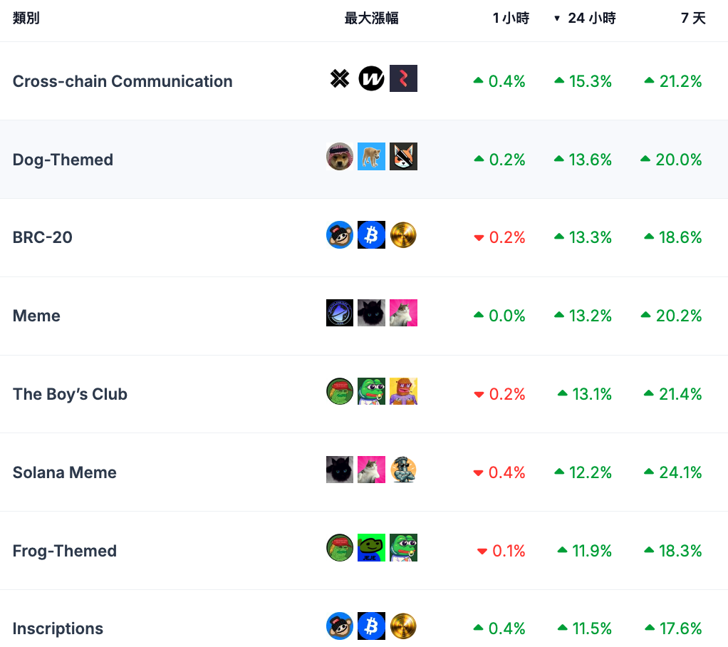 随 著比特币突破 6.5 万美元,加密货币市场一片繁荣,迷因币等山寨币普遍出现复甦行情,市场总市值上涨 2.4%,达到 2.39 兆美元。据 CoinGecko 数据显示,近 24 小时内涨幅最大的赛道是跨链通讯协议,其次为迷因币与 BRC20。