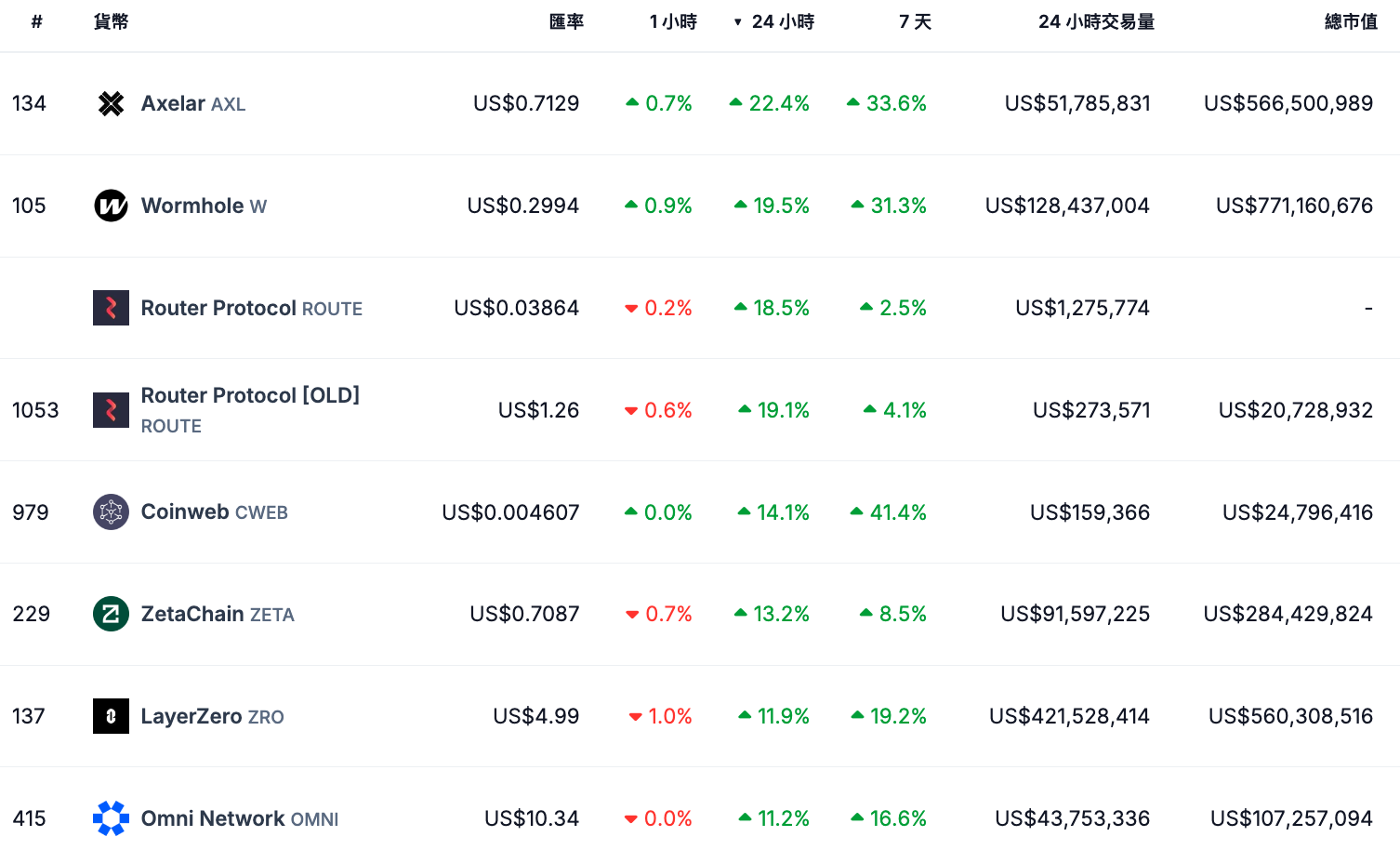 在跨链通讯协议赛道中,近 24 小时涨幅最高的代币不乏市值前 200 大币种,也不少今年才推出的代币,这包含有: