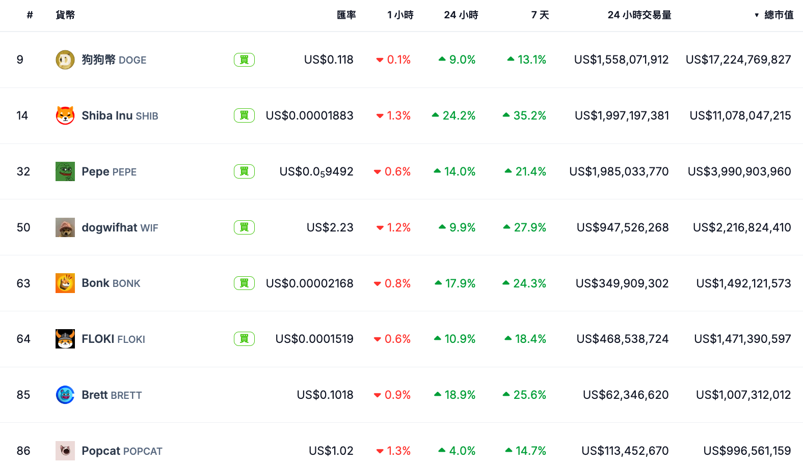 而在迷因币赛道中,较为币圈社群熟知的无不是狗、猫、青蛙等动物,而近期在泰国的侏儒河马宝宝「弹跳猪」引起全网关注下,其同名迷因币 $MooDeng 近 24 小时再度上涨 77.7% 达 0.1762 美元,与 动区先前报导 当天的高点相比暴涨逾 52 倍。 迷因币赛道显得更加热闹,其中市值前几大的币种迎来亮眼表现: