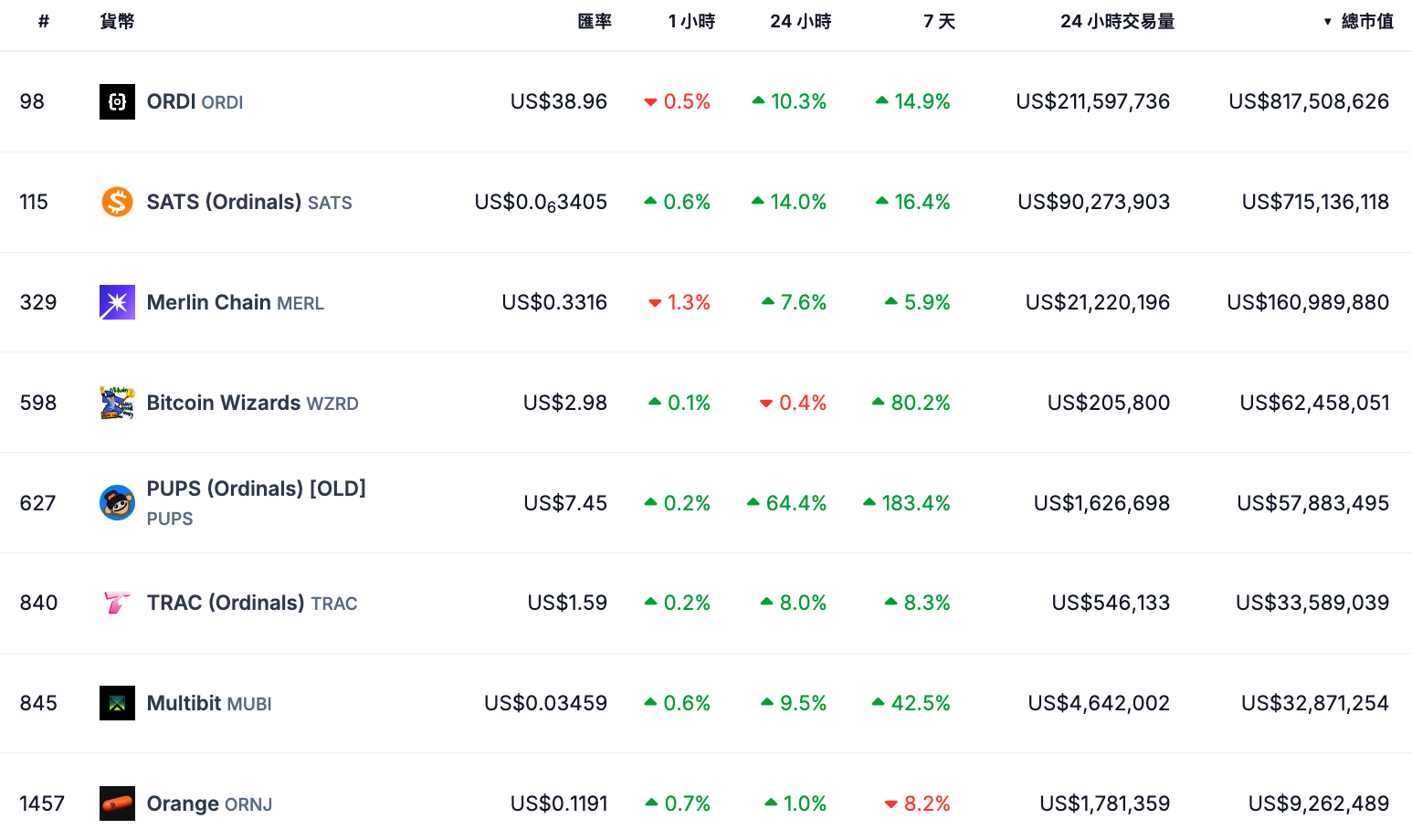 比特币生态相关资产表现也不逊色,Ordinals NFT、BRC20 和符文等皆强势反弹,尤其是 PUPS 近 24 小时飙涨逾 64%,价格现报 7.45 美元,市值达 5,788 万美元,其他表现亮眼的代币还有: