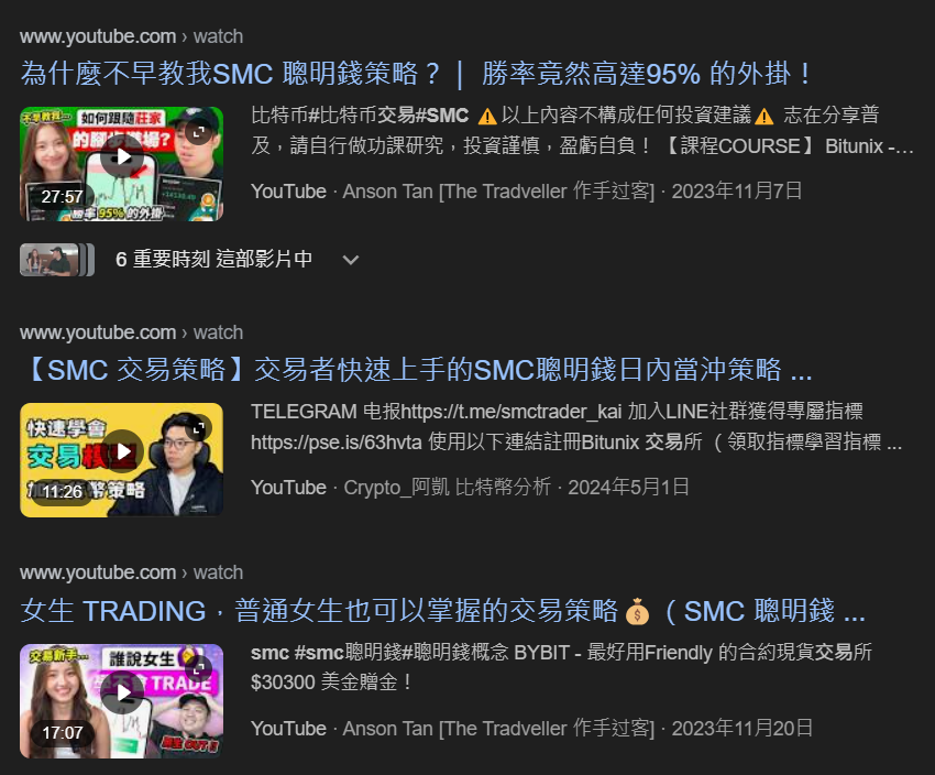 对此观点,有一位 YouTuber「蓝宝人」也在 5 个月前发布了一个 影片 ,表示 SMC 并不一种交易圣经,SMC 交易的核心缺点就是,实际上市场上同时有成百上千家机构在参与交易,每一根 K 缐都是市场资金博弈后的结果,因此判断机构动向本来就是一件非常困难甚至可笑的事,因此对机构的高度依赖性,导致 SMC 对普通的散户交易员并不是一种胜率高的交易方法,这也不是一种解释市场变化的好的理念: