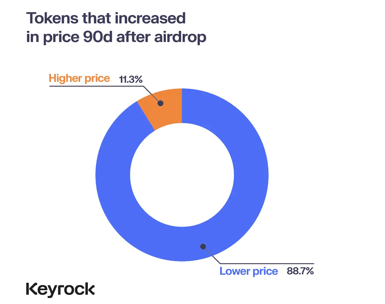 大多数空投在 15 天内崩溃。在 2024 年,尽管最初价格飙升,但 88% 的代币在几个月内贬值。