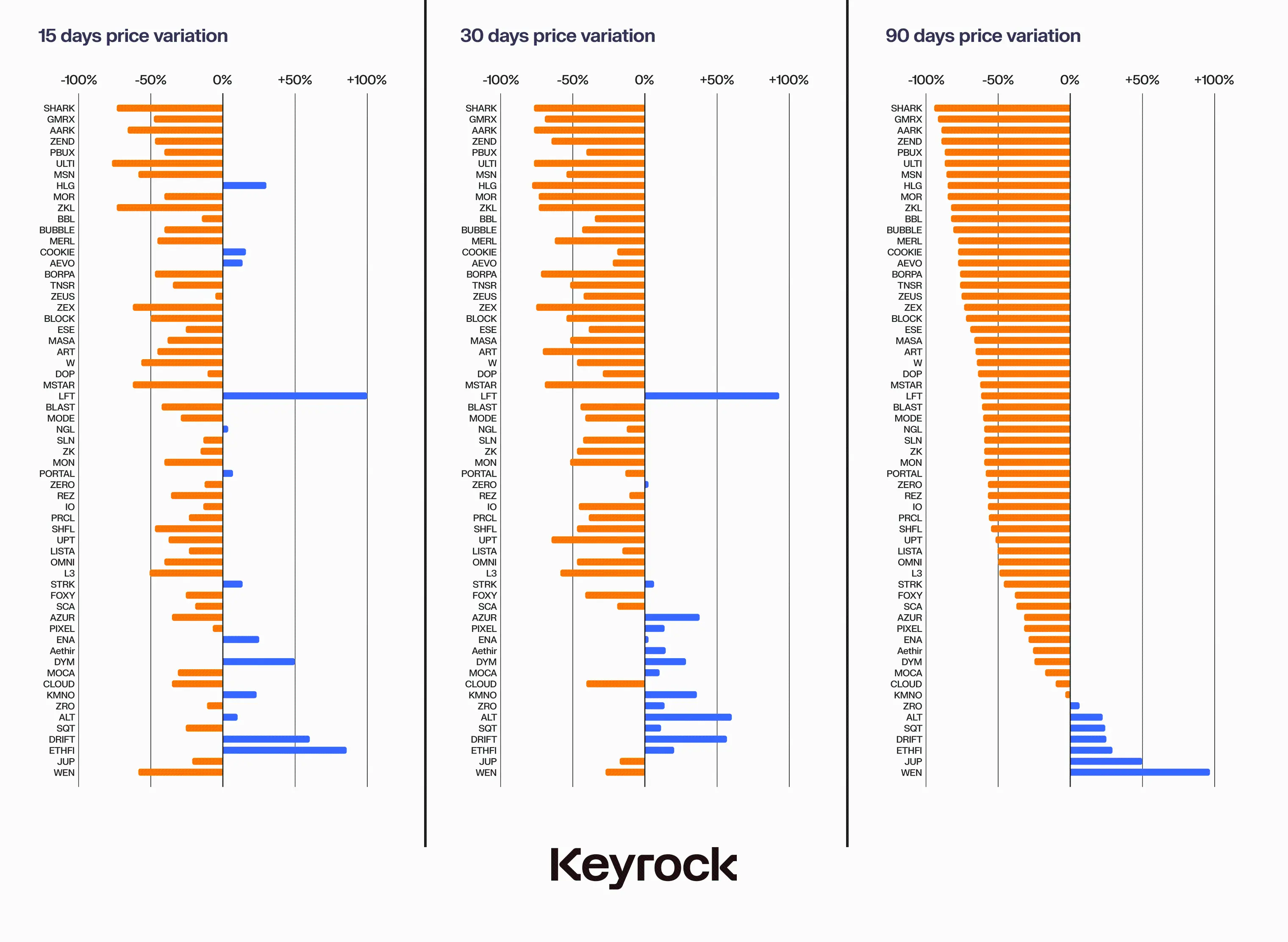 观察 15 天、 30 天和 90 天的价格走势,很明显大部分价格变动发生在空投后的最初几天。三个月后,很少有代币能够实现正收益,只有少数几个逆势上扬。尽管如此,重要的是要考虑更广泛的背景:在这段时间内,整个加密市场的表现并不好,这使得情况更加复杂。