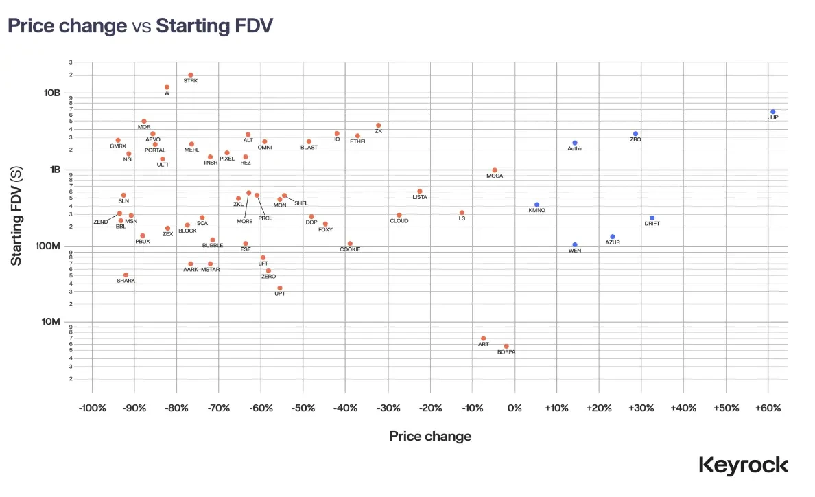 一个重要的关注领域是,代币在启动时的完全稀释价值(FDV)是否对其空投后的表现产生了显著影响。FDV 代表如果所有可能的代币都在流通,包括尚未解锁或分配的代币,加密货币的总市场价值。它通过将当前代币价格乘以总代币供应量来计算,包括流通代币和任何锁定的、归属的或未来的代币。