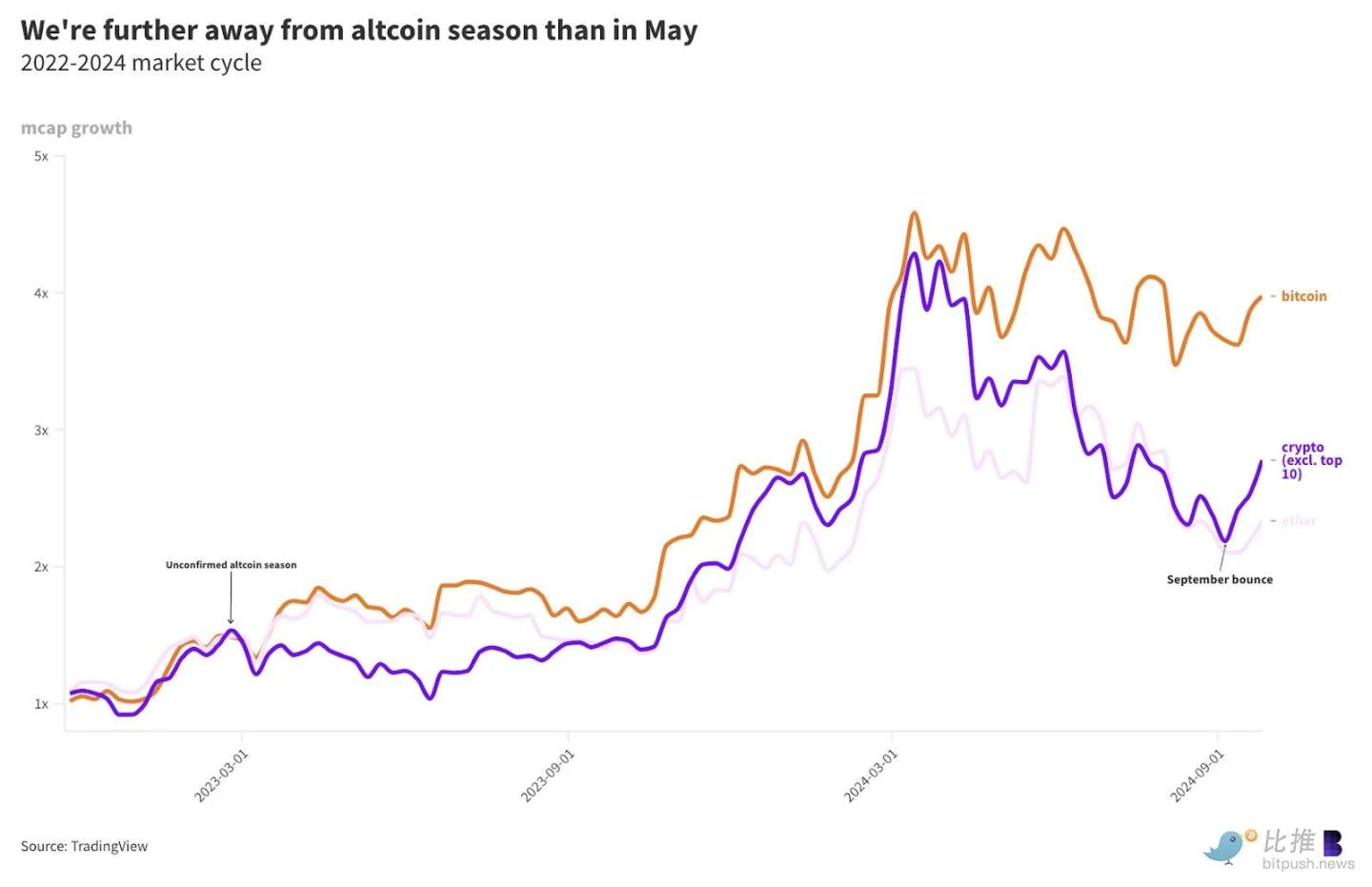 与此同时,山寨币在同一时期的增长幅度不到 2.8 倍,这意味着我们距离山寨币季节还有整整一个数量级的差距。