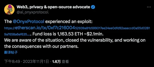 Odaily星球日报调查发现,去年 11 月,Onyx 同样受到黑客攻击,被攻击的原因同样是黑客利用 Compound V2 分叉版本背后的已知舍入问题。但当时 Onyx 社区负责人 Alex 表示,漏洞得到修复,正与合作伙伴一起处理后续。