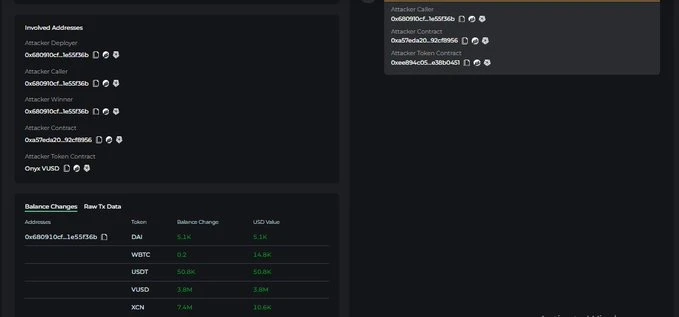 昨日,借贷平台 Onyx Protocol 被黑客利用漏洞攻击,损失价值超 380 万美元,被盗资金包括 1300 万枚 VUSD、 735 万枚 XCN、 5000 枚 DAI、 0.23 枚 WBTC 和 5 万枚 USDT。