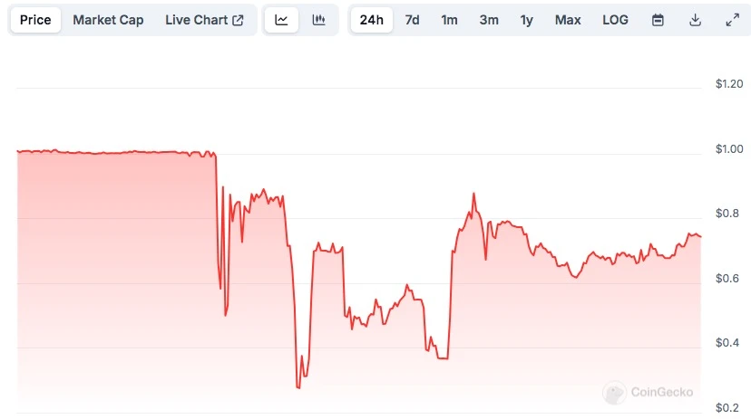 CoinGecko 数据显示 ,VUSD 立即脱锚,最低跌至 0.2757 美元, 24H 跌幅达 72.43% ;截至发文,VUSD 依旧处于脱锚状态,但已回升至 0.7228 美 元,24H 跌幅收窄至 28.3% 。