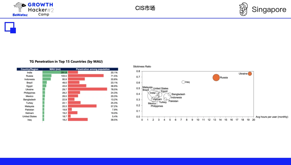 整个 TG 生态立的市场高地在 CIS 地区,俄语区的市场「高地」不光体现在用户数量,更是用户质量、用户使用时长、用户 commitment,这块市场是最值得做的。 Notcoin、Dogs、Hamster 等明星 TG 项目来自俄语区,而 Catizen 已经做了很好的俄语市场融入。其他地区如印度虽然人数 MAU 最高,但是用户价值与渗透率均不高,另外,还有些市场比如伊朗反倒是值得关注。