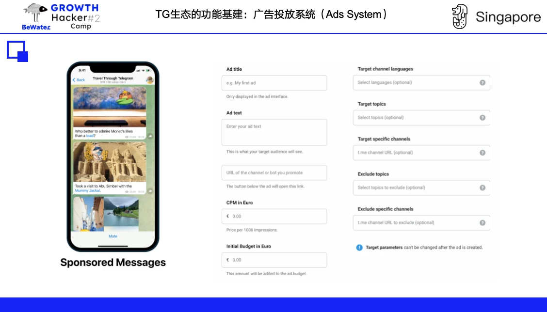 TG 广告系统尚未出现工业化获量方式,因此,TG 也出现了民间广告系统解决数据层的问题。 TG 广告系统分为官方和民间的广告系统。目前 TG App center 中仅有编辑人工精选,what's new 功能。此外,Appbar 有个性化推荐,目前官方广告系统广告位只支持公众号图文式插入,投放效果在官方不收集用户信息的情况下目前无法实现精准投放,这与 TG 创始人的产品理念,对 Facebook 通过手机用户信息来实现广告投放的行为并不认同有关。因此,TG 也出现了民间广告系统,正在通过链上数据、群表现等各种形式解决数据层问题。