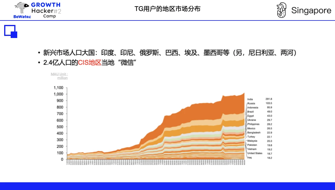 除发达国家之外,TG 是 2.4 亿人口的 CIS 地区的「微信」,另外重点市场包括印度、印尼、尼日利亚和伊朗等第三世界新兴市场的人口大国, Telegram 接近 10 亿的用户,其实 Crypto 用户比例还并不是那么高 ,在很多国家就是一个国民 IM 软件使用,而不是擦边、地下通讯软件。