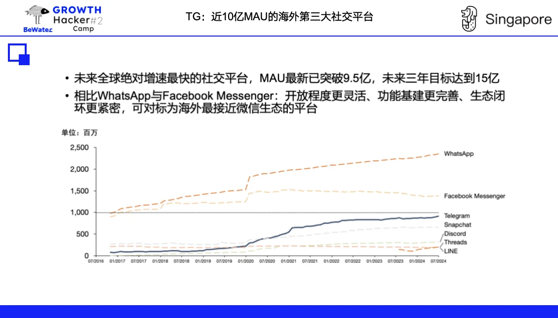 TG 是未来全球绝对增速最快的社交平台,MAU 最新已突破 9.5 亿,是 2.4 亿人口的 CIS 地区的「微信」。 现在一个十亿量级的 APP,未来三年 target 达到 15 亿,即 50% 的绝对增速。很难想象微信、抖音还会有 50% 的增速。相比 Top 2 的 WhatsApp 与 Facebook Messenger:TG 开放程度更灵活、功能基建更完善、生态闭环更紧密,可对标为海外最接近微信生态的平台。