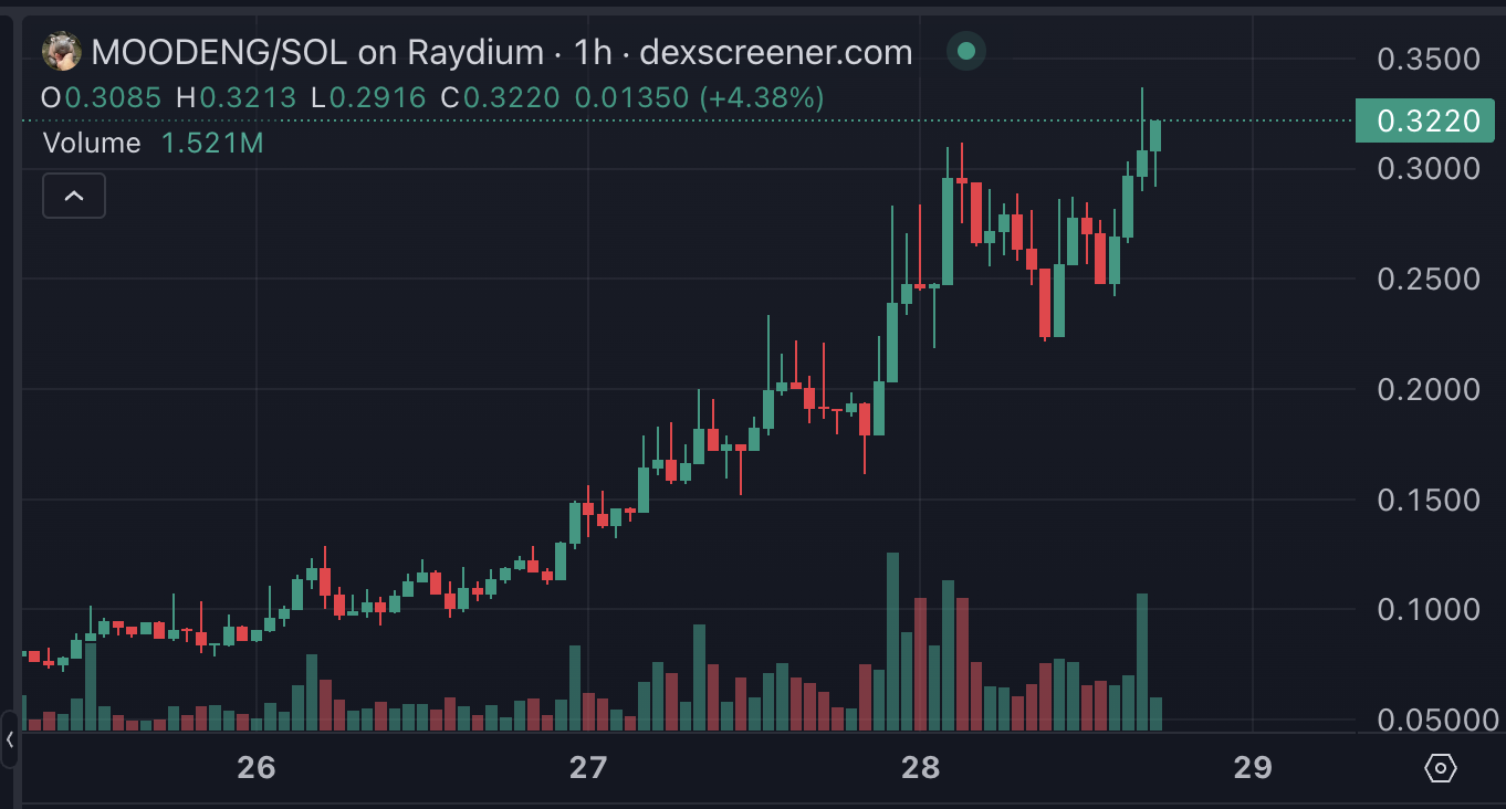 其中,最引人注目的迷因币是泰国侏儒河马宝宝「弹跳猪」 $MooDeng ,近 24 小时涨超 70% 达 0.3249 美元,市值突破 3 亿美元,跃升为 CoinGecko 平台第 215 大币种。