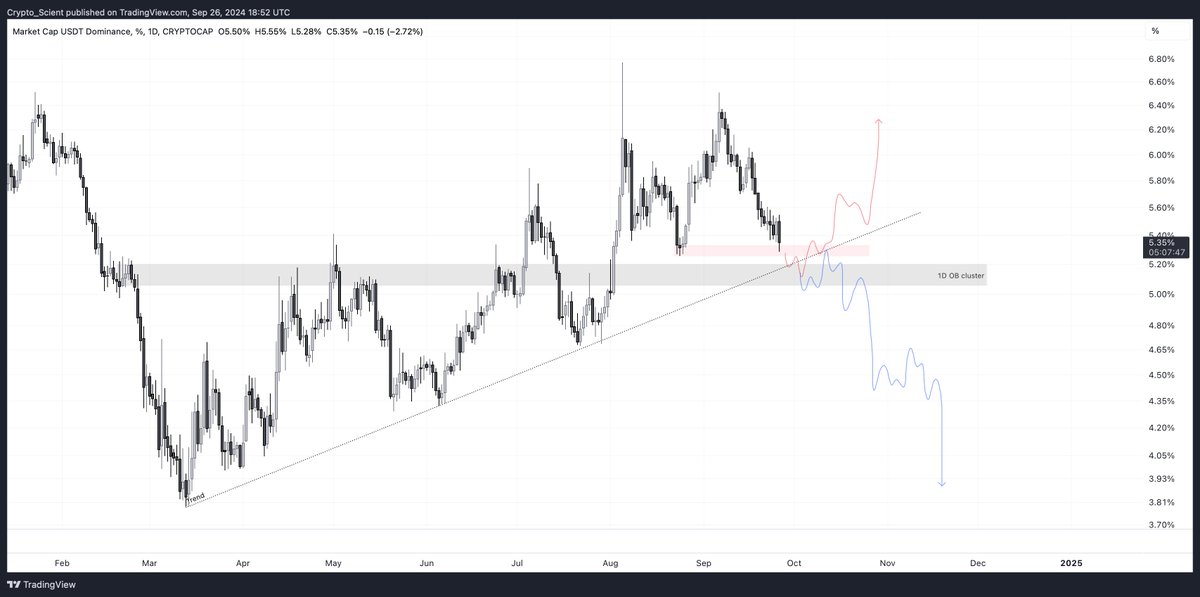 @Crypto_Scient 认为可以用 USDT.D (USDT Dominance) 的走势来推测后续 BTC 的发展:如果 USDT.D 遵循红色路径,在日线流动性聚集区域中抢占流动性,然后回踩上升趋势线后上涨,那么 BTC 会呈现空头走势;如果 USDT.D 遵循蓝色路径,突破趋势,将趋势反转,那么 BTC 会走出多头趋势到达历史新高。现在需要等待观察 USDT.D 走出确切的信号,再决定后续的交易策略