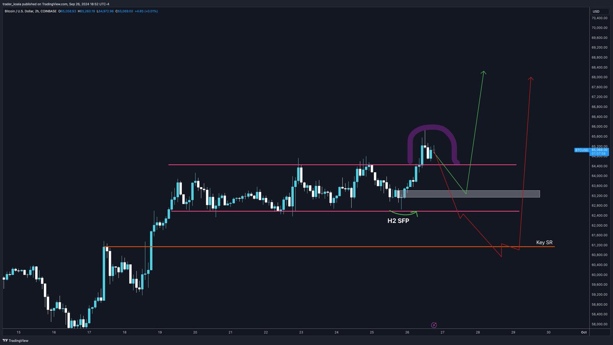 7 月 29 日 BTC 突破 70,000 美元 后,开启了一轮下跌趋势,在 8 月 5 日到达 49,000 美元又反弹至 65,000 美元 继续下跌在 9 月 6 日在 53,000 美元附近形成了类双底结构后,9 月 19 日美联储确定降息,BTC 顺势上涨。9 月 26 日美盘时段,伴随着美股指数的强势上涨,BTC 已经突破前一轮高点 65,000 美元,破坏了更低的低点和更高的高点的结构。