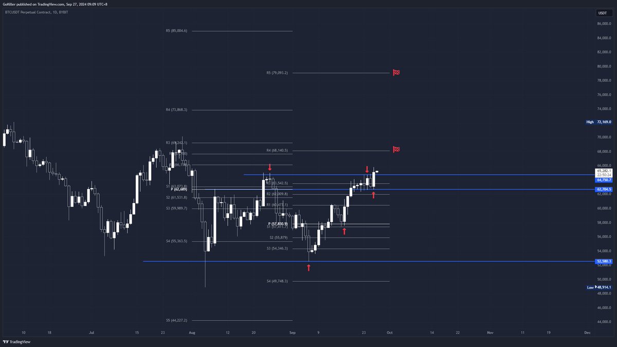 @goukiller 认为在周线级别的博弈中,Pivot Point 的 R3 防守成功,还是处在上涨行情中,后续上涨目标为 R4 68,100 美元和 R5 79,000 美元。