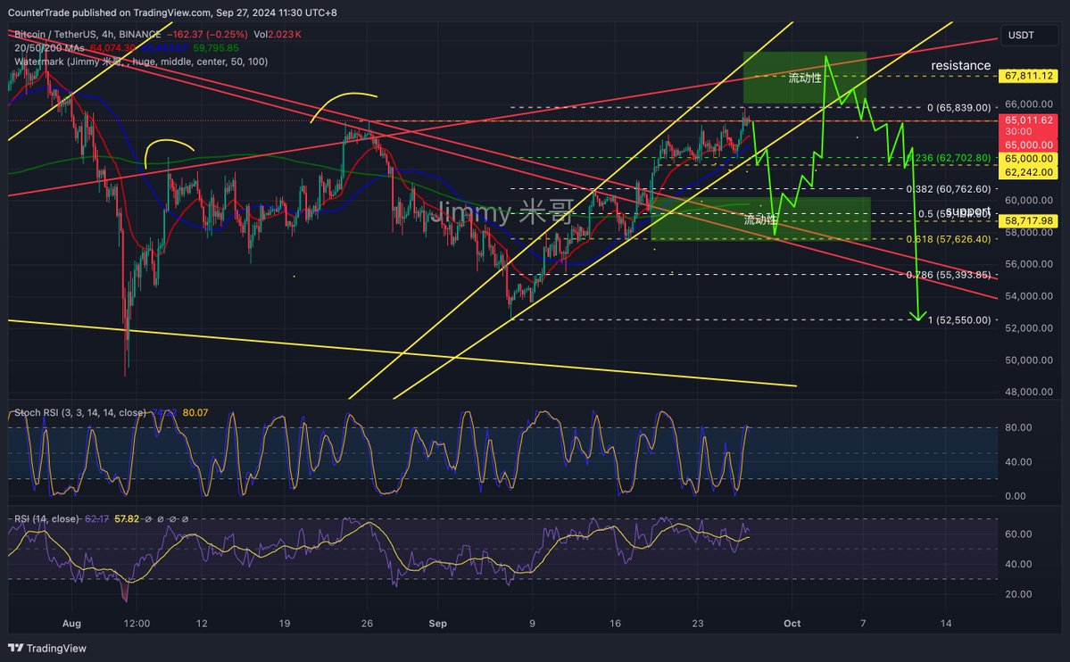 @CryptosLaowai 认为 BTC 已经捕捉了 65,000 美元的流动性,这里可能会出现暴跌。BTC 从 53,000 美元 以来开启的上涨趋势的形态是上升的扩张楔形,楔形接近尾声会出现方向的选择,大概率会向下,目标是回测 57,000 美元至 59,000 美元的支撑,然后捕捉上升趋势线的流动性大概在 68,000 美元的位置随后下跌。