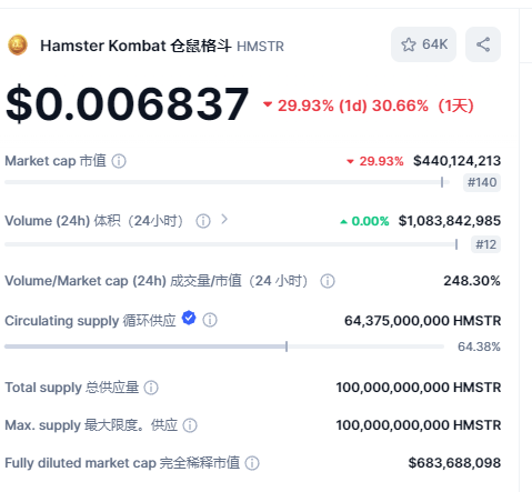 9 月 26 日,号称拥有 3 亿玩家的 TON 生态点击小游戏 Hamster Kombat ( 仓鼠快打)正式发布空投,其生态代币 HMSTR 同时在币安、OKX、Bybit、Gate.io、Bitget 等十多个主流交易所上线。