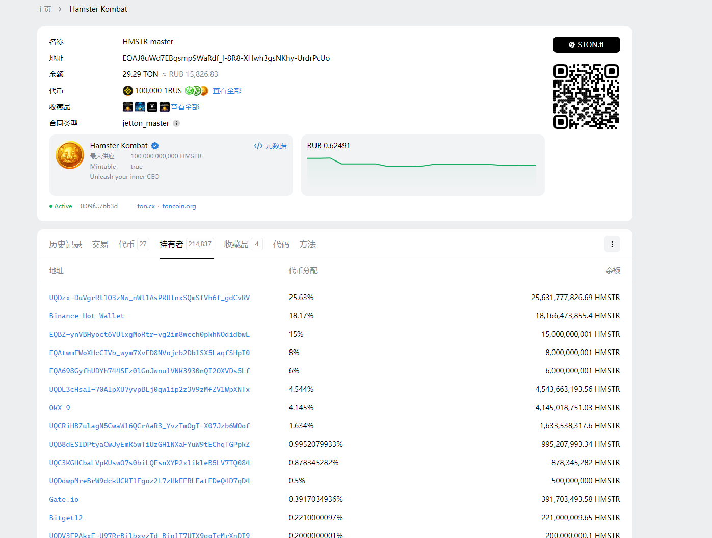 截至 9 月 27 日,币安地址的 HMSTR 占比约 18% 成为各大交易所占比最高,Bybit、OKX 等家紧随其后。根据 CMC 的数据显示,HMSTR 近 24 小时的交易量超过 10 亿美元,排名全网代币的第 12 名,币安交易所的交易额占比将近一半,成为 HMSTR 空投后的最大市场。不过,具体 Hamster Kombat 为交易所们带来多少新增用户目前还无处得知。此前 Bybit 创始人 Ben Zhou 在接受吴说采访时也预计, Hamster 的拉新效果可能会开始递减。而从链上的数据来看,HMSTR 代币的持有地址仅为 21.4 万个。
