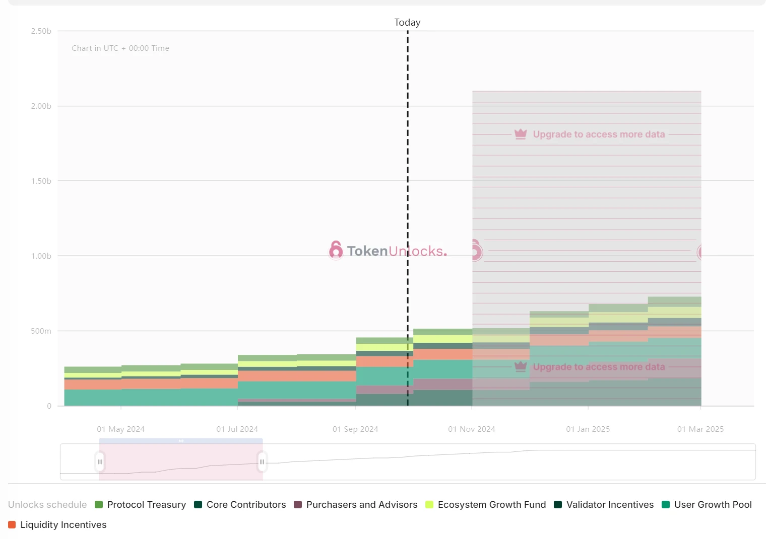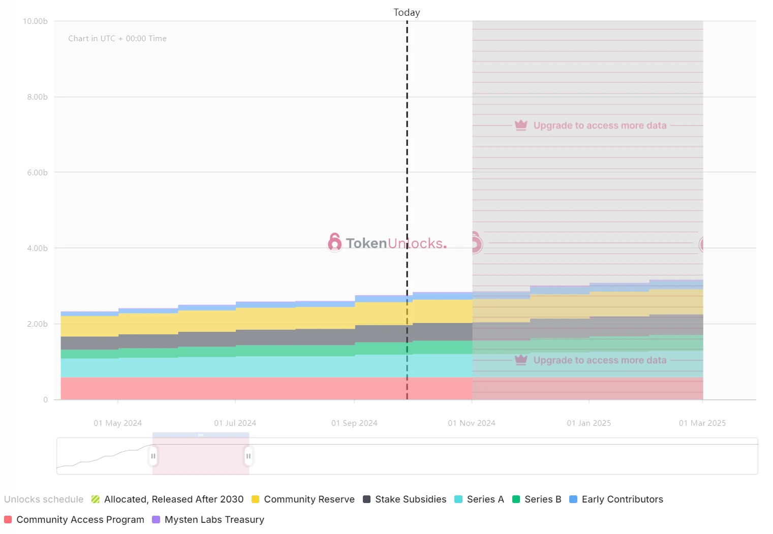 Sui 当前流通比例为 27% ,正处于解锁最快速时期。本轮解锁分别包括 A 轮融资 1984 万枚(3273 万美元)、B 轮融资 1932 万枚(3188 万美元)、社区储备 1263 万枚(2084 万美元)、早期贡献者 1034 万(1706 万美元)、Mysten Labs 财库 207 万枚(341 万美元)。