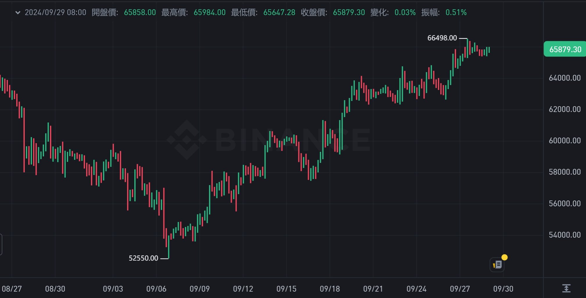 比 特币在本月涨势强劲,在 27 日突破 66,000 美元关卡,最高来到 66,498 美元,创下自 7 月底来新高,随后持续在 6.6 万美元附近震盪。截稿前报 65879 美元,近 24 小时下跌 0.5%,近 1 个月上涨 11%。
