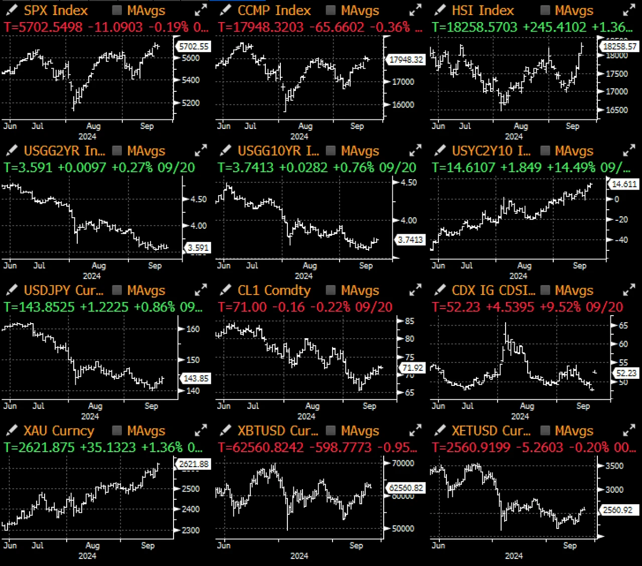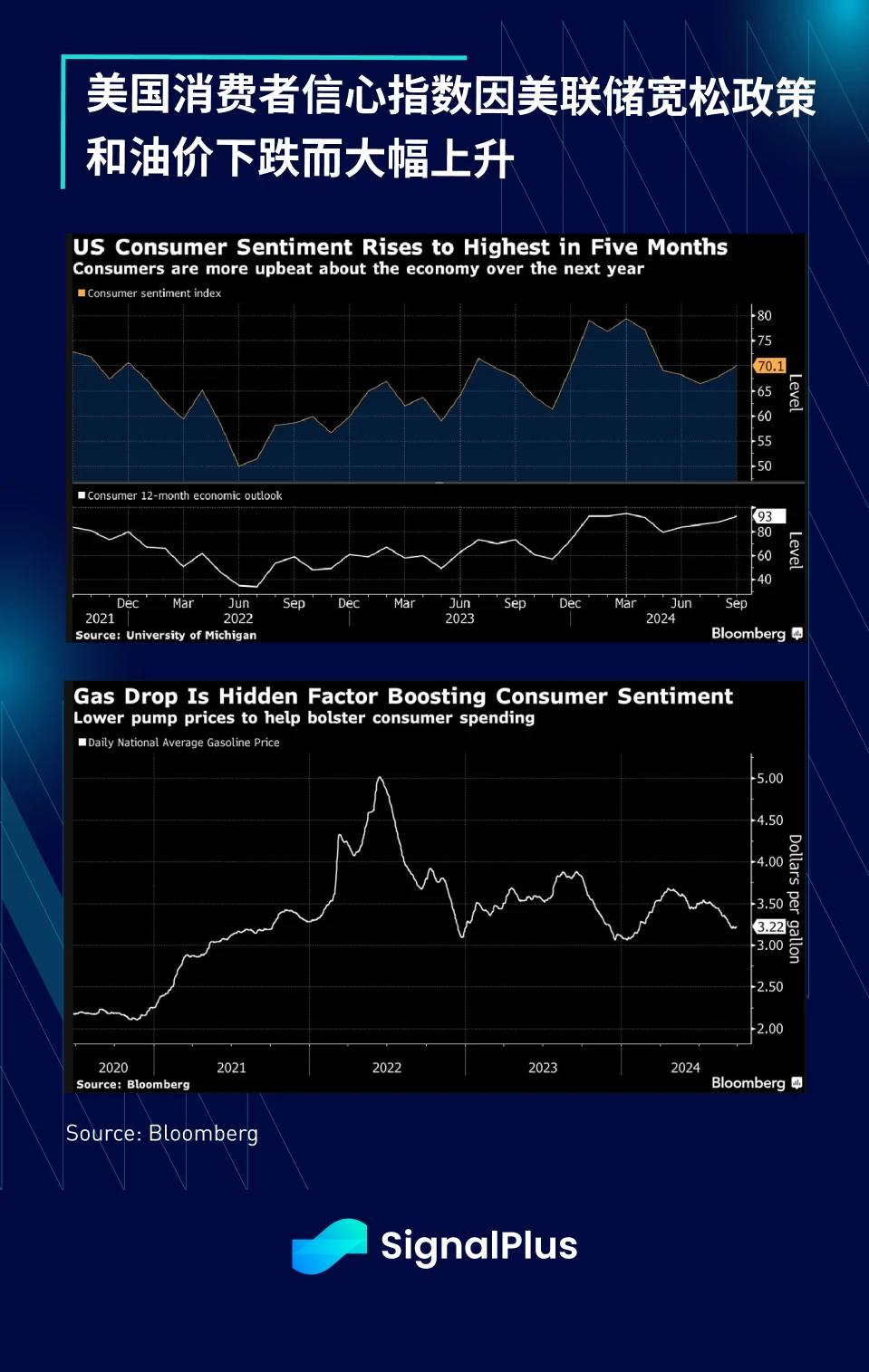 另一方面,在美联储大幅宽松和油价下跌的背景下,美国消费者信心跃升至 5 个月以来的高点。全球 beta 交易有所回升,中国和香港股市经历了多年来最好的一周(沪深 300 指数上涨 16% ),这要归功于中国的“重磅”刺激政策,在中国人民银行宣布宽松政策后,著名投资人 David Tepper 呼吁市场投资者“买入一切”中国相关资产。