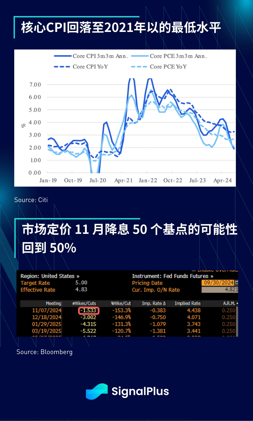美国核心 PCE (以及欧洲 CPI)数据疲软,为风险情绪友好的一周划下句点,美债收益率曲线继续牛陡走势,而美中股市双双徘徊在周期高点。在 3 个月移动平均的基础上,CPI 和 PCE 的年化核心通胀已回落至 2% 水平附近,往美联储的 2% 长期目标前进,使美联储能够继续专注于就业市场方面的任务。CPI 公布后,多家投行重申了他们对 12 月降息 50 个基点的预测,而利率期货定价 11 月降息 50 个基点的可能性回到 50% 左右。
