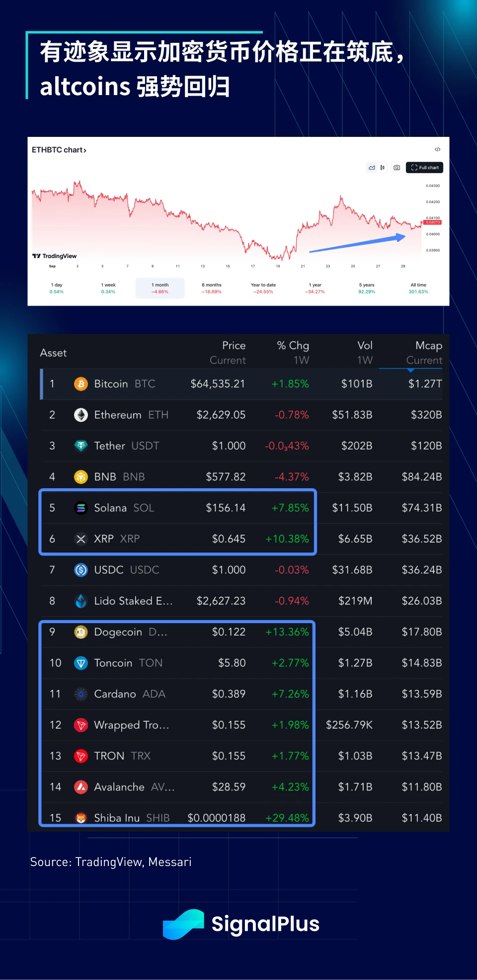 在加密货币方面,BTC 在流动性宽松的背景下表现出色,强劲的经济成长、稳定的企业盈利和鸽派的央行为 BTC 第四季度的反弹奠定了坚实的基础。尽管自 7 月以来 ETF 的资金流量令人失望(ETH ETF 流出 6.1 亿美元,BTC ETF 流出 3.3 亿美元),但在最近的反弹中 ETH 表现突出,altcoins 也强势回归。