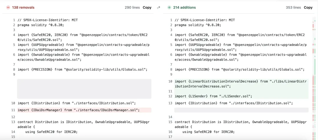而 DAI 的挖矿合约,是 AO 团队在 Distribution.sol 的基础上魔改的,实现了将 DAI 存入了 DSR 之中,较收取 stETH 的功能复杂了几个量级。