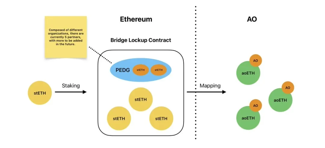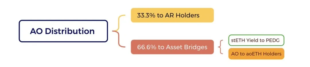 过渡阶段(2024 年 6 月 18 日起) : 从 6 月 18 日开始,AO 引入了跨链桥。在这个阶段,新铸造的 AO 代币被分为两部分: 33.3% 继续分配给 AR 代币持有者,而 66.6% 用于激励资产桥接到 AO 生态系统,目前用户可以通过存入 stETH(未来还会添加更多的资产类别)来参与这一阶段的代币分配。这一块是参与 AO 生态的重头戏,下面会展开说。