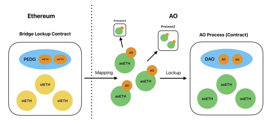 然而,当这 1 颗 stETH 通过 AO 资产桥被跨链后,以太坊的主网的跨链桥合约会收到 1 颗 stETH,用户的 AO 链地址中会获得 1 颗 aoETH,而要注意的是 aoETH 并不会像 stETH 那样随着时间增加余额。