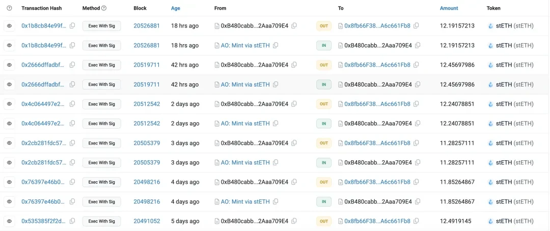 目前,已经有 151, 570 颗 stETH 存入了 AO 的跨链桥,据链上观察,项目方每天使用 bot 定时收菜,每日收益约为 12 颗 stETH。