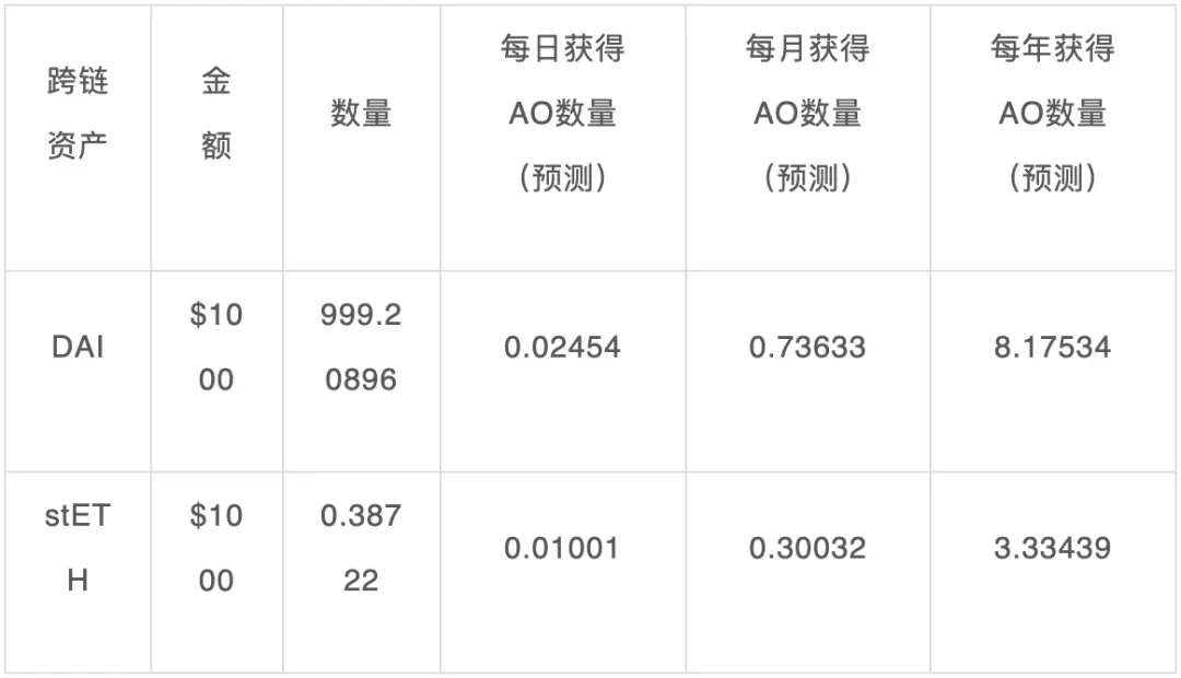 假设分别用 1000 美金的 stETH 和 DAI 来跨链挖 AO,我们通过预测最终获取 AO 的数量,来比较两者的性价比。