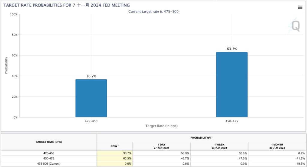 根据芝商所 FedWatch 工具 ,预测联準会在 11 月会议上降息 1 码的机率目前上升为 63.3%,降息 2 码的机率则降为 36.7%。