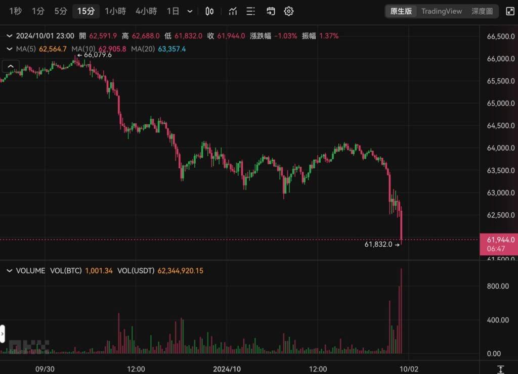 市 场快讯,比特币今晚 11 点后跌破 62,000 美元大关!日内跌幅扩大至 2.81%。以太坊跌幅更深最低插针 2,480 美元。