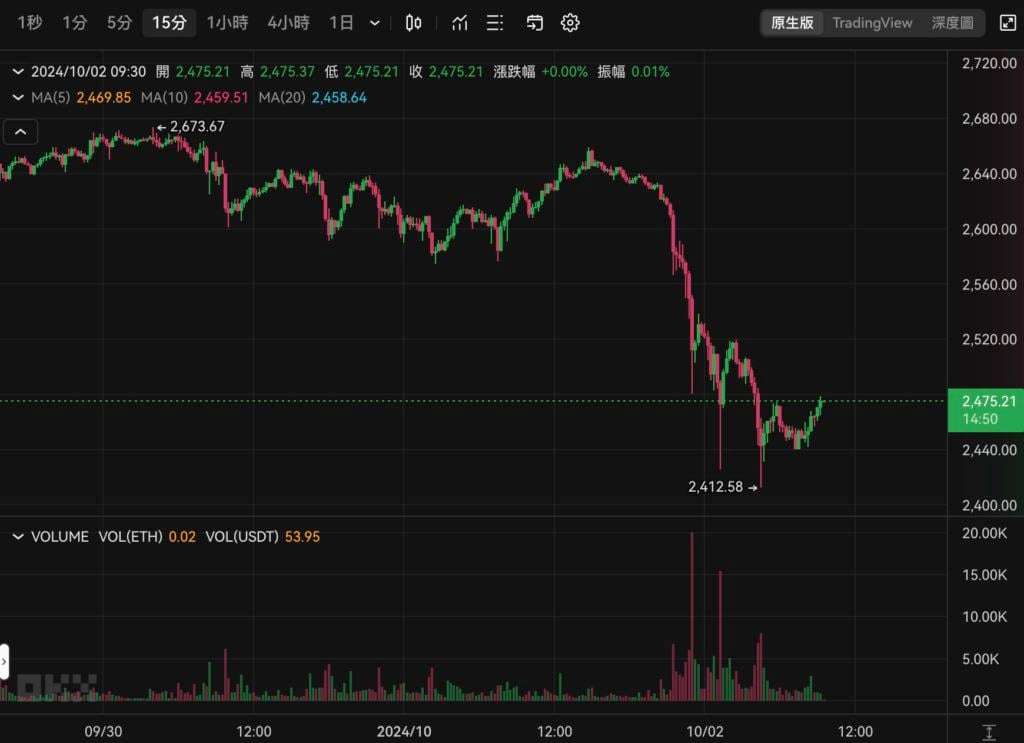 以太坊清晨最低则是插针 2,412 美元,截稿前回弹至 2,475 美元、近 24 下跌 5.75%。