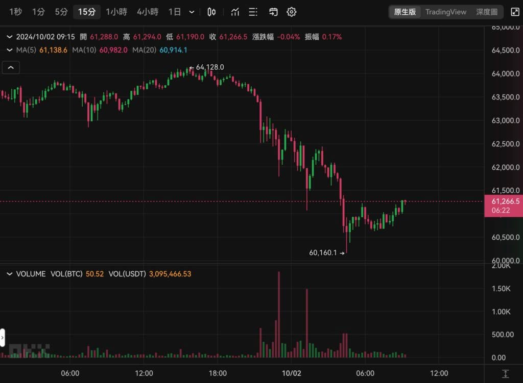 加密货币市场方面,比特币从昨晚 11 点后到今日清晨经历三波较大的跌幅,稍早 04:30 左右最低更是来到 60,160 美元。不过截稿前有所回弹,现报 61,266 美元、近 24 下跌幅度缩窄至 3.24%。
