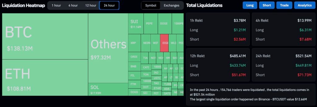 据 Glassnode 数据显示,近 24 小时在全网合约爆仓金额超过 5.2 亿美元,其中做多者爆仓超过 4.4 亿美元,共有超 15.4 万人遭清算。