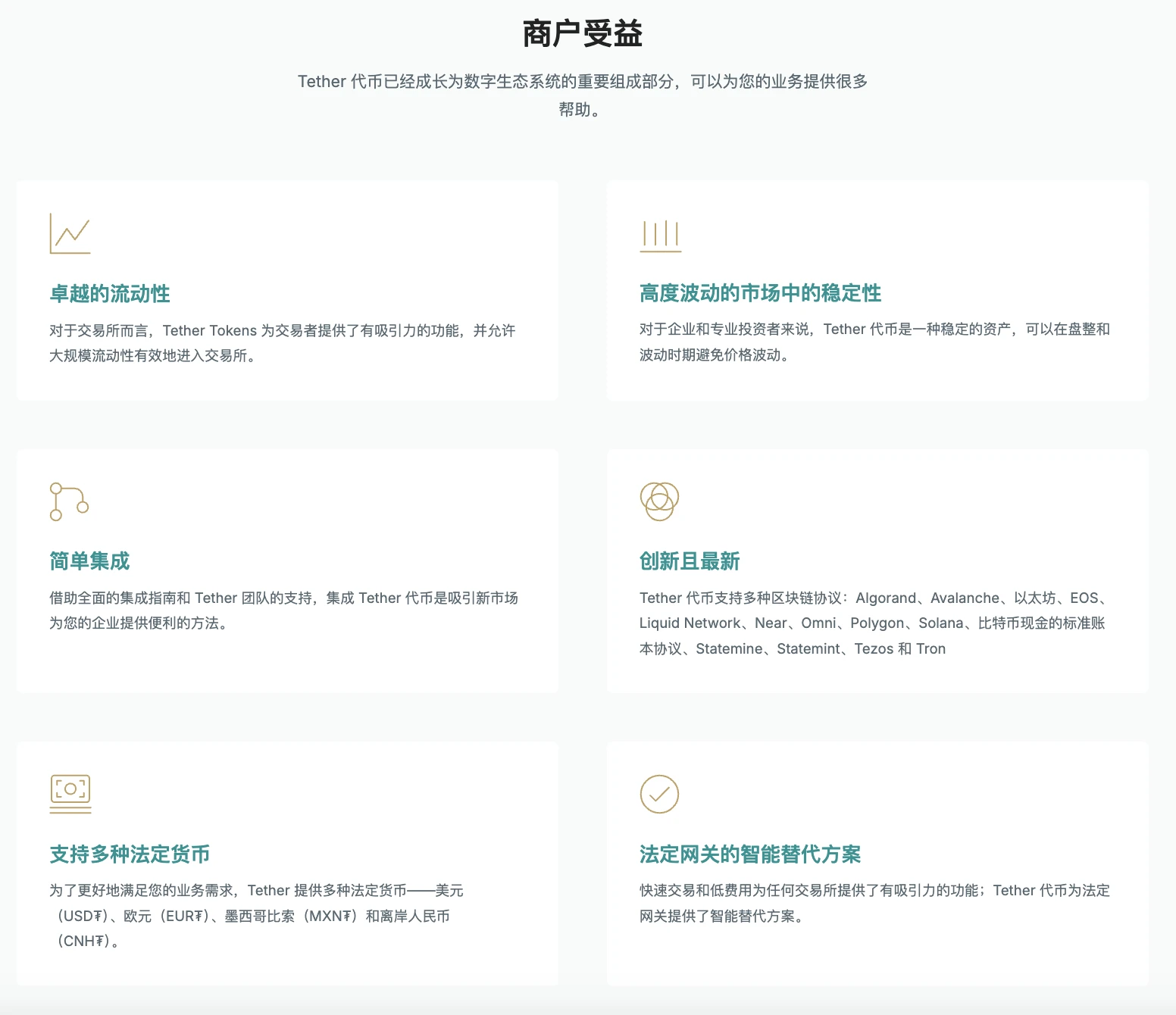 作为全球经济体系的重要组成部分之一,国际贸易(包含跨境电商等行业)对于快捷支付的需求同样迫切且市场广阔,而 USDT 某种程度上已成为该领域内多方认可的“支付工具”之一。毕竟,相较于流程复杂、成本高昂且规则颇多的全球 Swift 银行电汇体系,USDT 的优势无疑极为明显:高效、便捷、稳定且成本更低, 相关优势 在 Tether 官网也有说明。