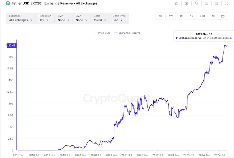 据 CryptoQuant 研究主管 Julio Moreno 此前 表示 ,过去几个月稳定币市值的上升可能有助于比特币和其他主要加密货币的潜在上升趋势;稳定币不断增长的市值是推动加密货币价格上涨的关键因素,因为它们为加密市场提供了流动性。 目前,加密货币交易所 USDT 储备也已达到了 225 亿美元的历史新高,正如其提到的: “稳定币就像加密货币市场的血液”,今年 9 月的比特币价格与稳定币交易所净流入量之间存在高度相关性。