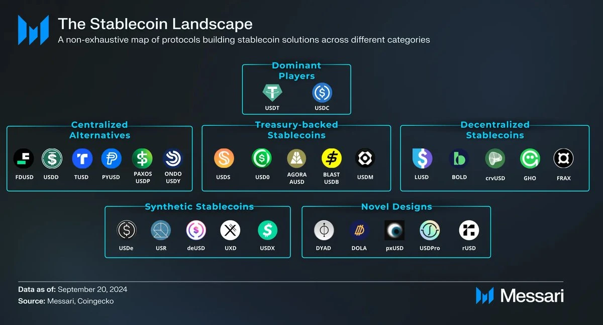 根据 Messari 研究员 Addy 此前发布的 《概览稳定币市场各家产品及其特色》 一文提到的信息,稳定币版图目前可以粗略划分为统治级别玩家(即 USDT 和 USDC)、中心化替代方案、国债支持稳定币、去中心化稳定币、借贷型稳定币以及包括 DYAD 等在内的新型设计稳定币。