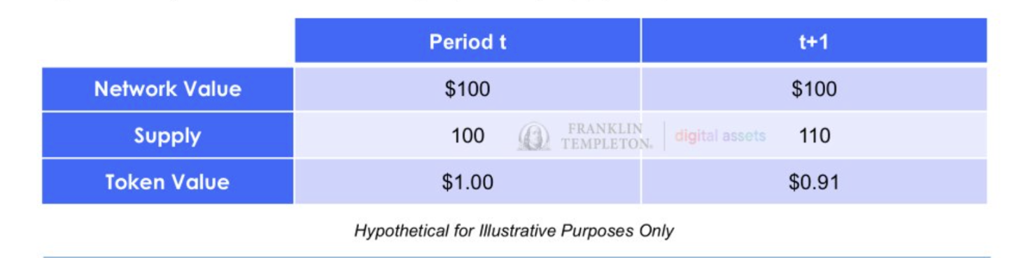 我们认为,关键点在于,尽管整个网络价值保持不变,但代币供应量的增加导致每个代币的价值下降。我们不认为增加供应会改变网络价值。 而如果认为代币价值不会因供应量增加而受到影响,就像是相信钱会从天上掉下来一样。