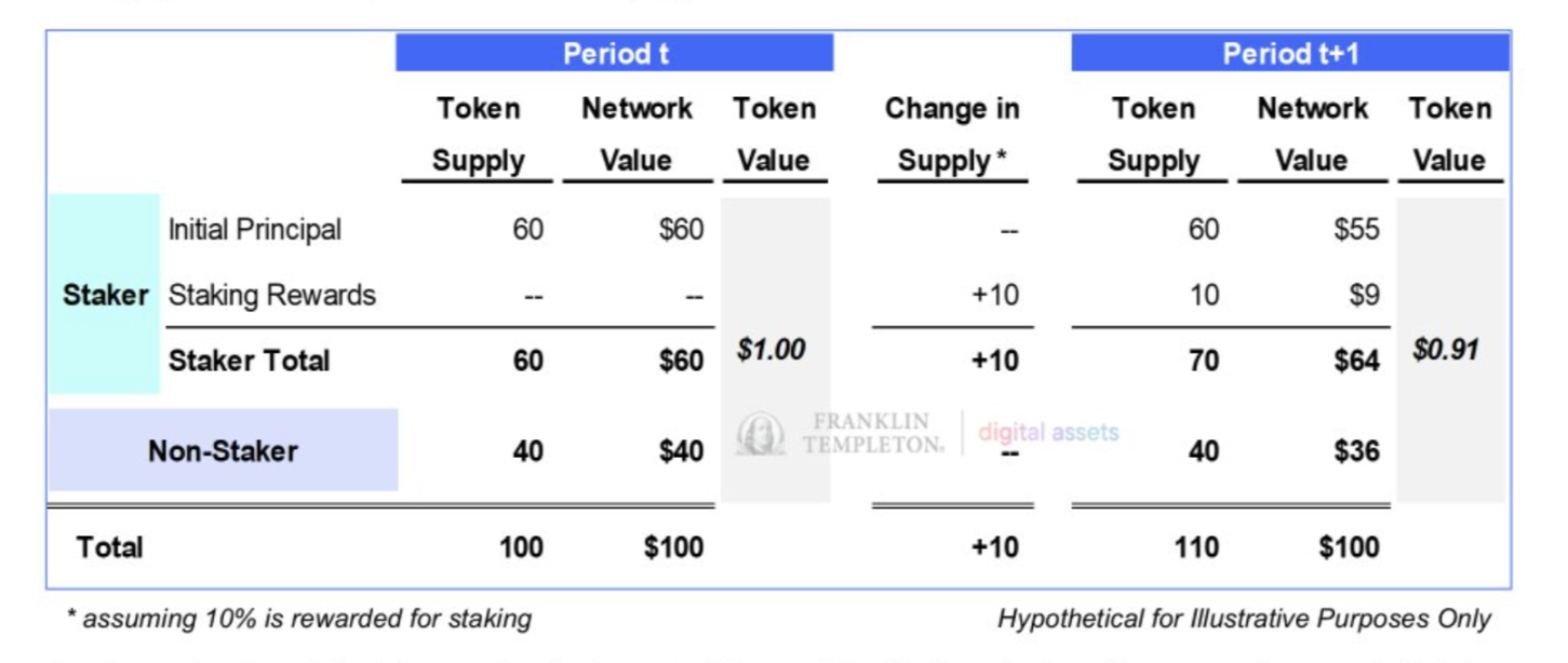 从一个角度看,网络价值受代币数影响,质押奖励引入了新的供应量,将相同的价值分配给更多的代币,从而降低了代币价格。相反,另一种观点认为网络价值是以市值定义的,因此质押奖励并不是网络的成本,因为它们纯粹是非质押者向质押者的价值转移。我们的观点是,这两种看法都是正确的,只是从不同的角度来看待问题。 质押奖励对代币价格来说是一种成本,因为供应量在增加;但它并不是网络价值的成本 ,因为代币供应影响的是代币的总数,而不是总价值。下表说明了从 t 期到 t+ 1 期供应量变化对代币价值的假设动态: