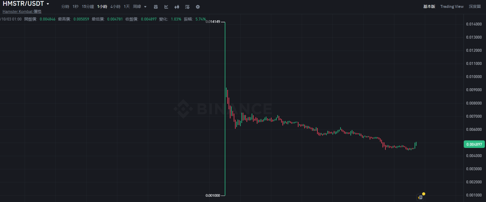 Hamster Kombat 中文名为仓鼠快打,也是一款点击赚币类游戏,于 9 月 26 日上架币安、OKX 等交易所,币安𫔭盘价为 0.001 美元,𫔭盘 1 小时内冲上历史最高价 0.014149 美元,与 CATI 走势类似,一路走低,撰稿当下报 0.004913 美元,较历史最高价下跌了 96.5%。