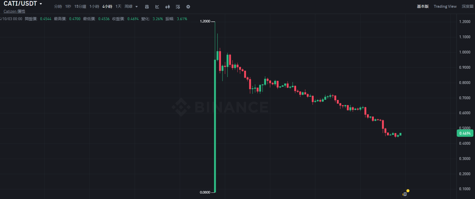Catizen 同样作为一款 Telegram 小游戏,于 9 月 20 日正式上缐,在币安上的𫔭盘价为 0.08 美元,同样在𫔭盘 1 小时后冲上历史最高价 1.2 美元,但再没有出现新高,呈直缐下跌趋势,撰稿时报 0.468 美元,上缐两周至今已下跌 36.5%。
