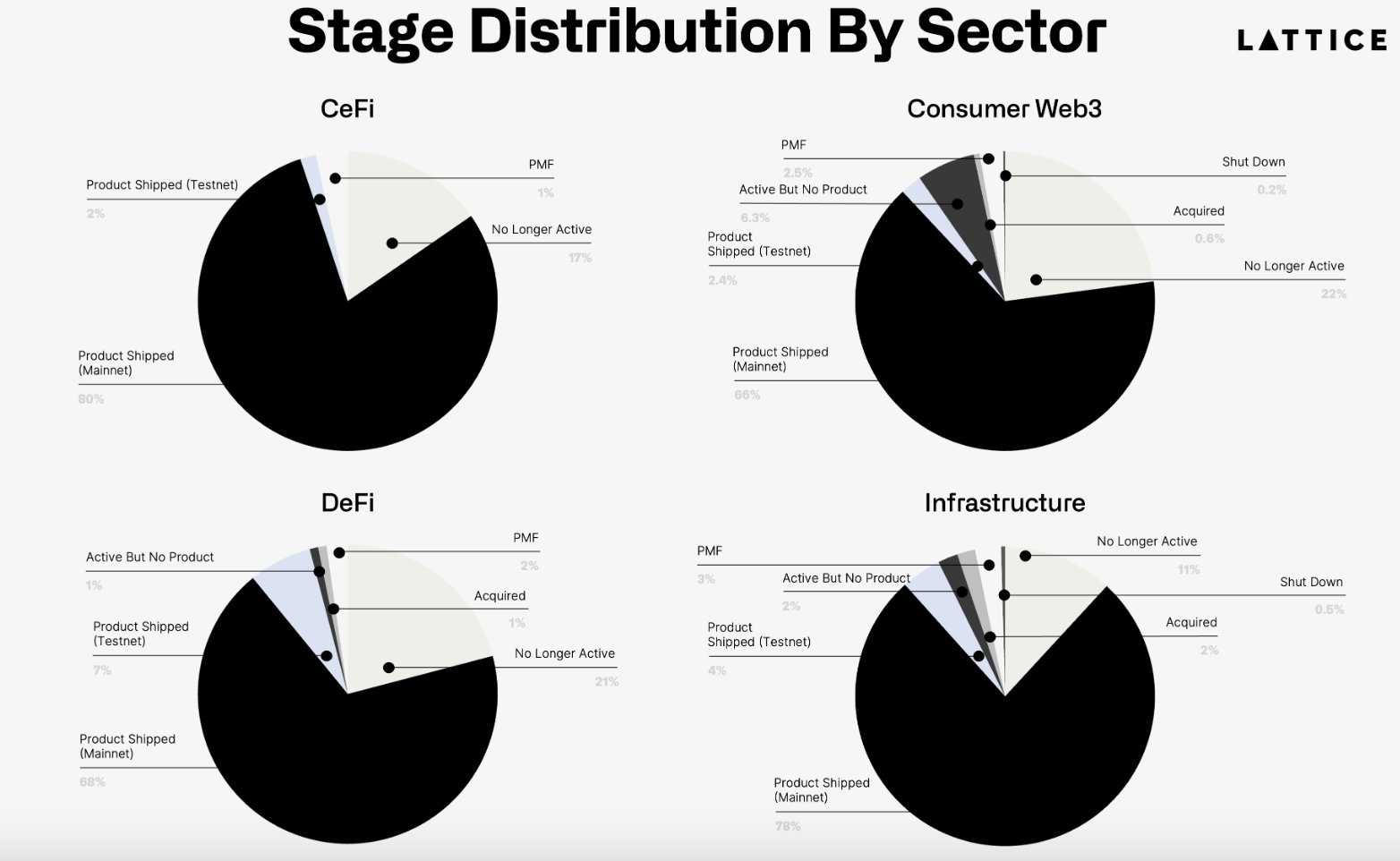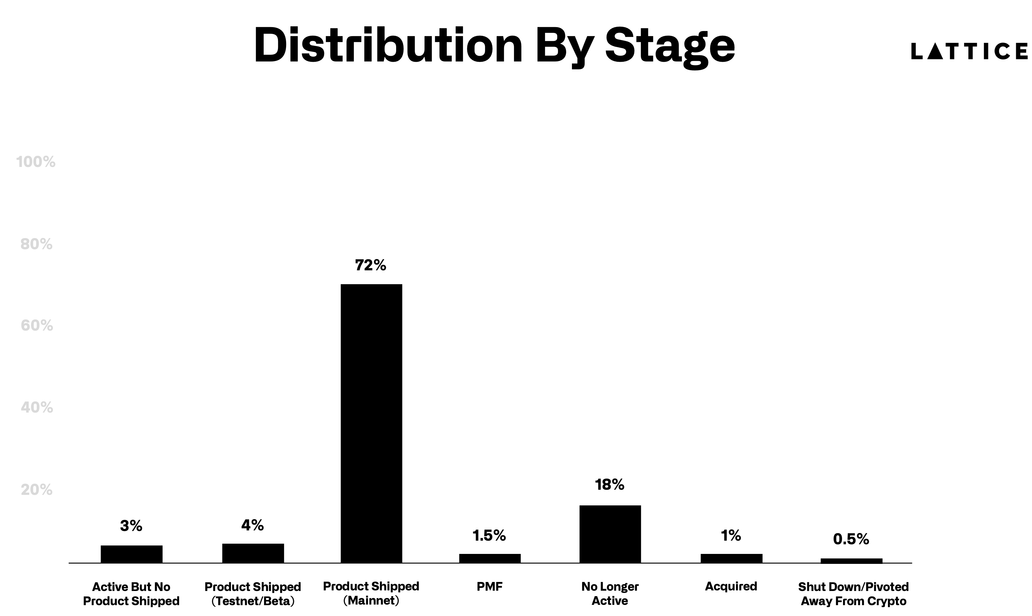 Lattice 发现,72% 的项目已成功在主网上缐,较去年的 66% 有所增加。而未能推出产品或已经关闭的项目有 18.5%,这意味著 2022 年筹资的早期项目中,至今仍有 80% 以上的项目保持活跃。不过,成功找到产品市场契合度 (PMF) 的团队显著下降至仅约 1.5%。