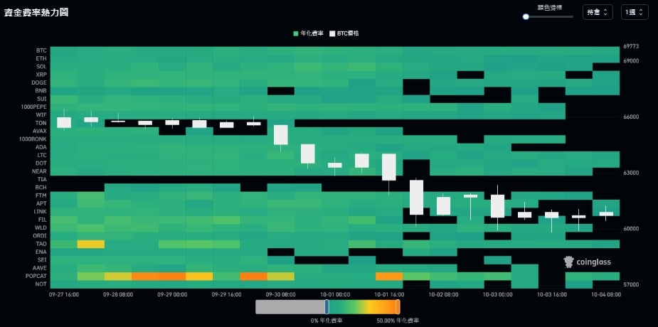 资金费率热力图 展示 了不同加密货币的资金费率变化趋势,颜色从零费率的绿色到 50% 正费率的黄色,黑色则代表负费率;白色 K 缐图则显示比特币价格波动,与资金费率形成对比。
